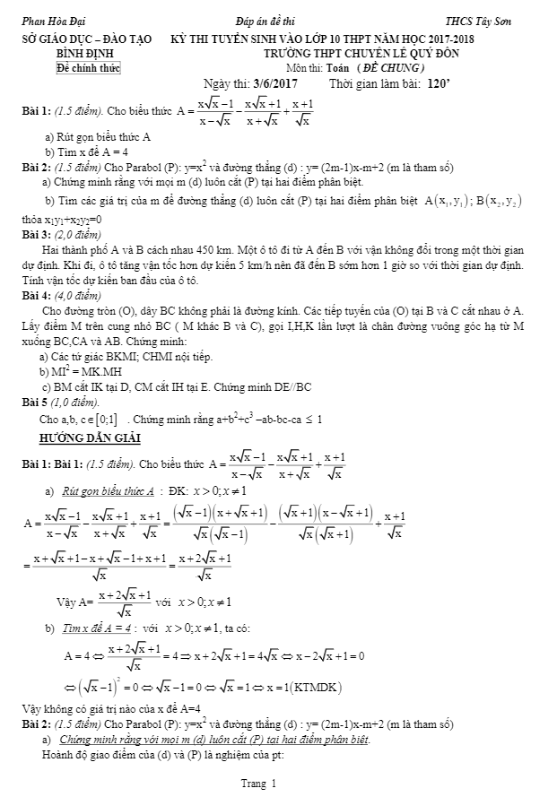 Đề thi tuyển sinh lớp 10 THPT năm học 2017 – 2018 môn Toán trường THPT chuyên Lê Quý Đôn – Bình Định là một đề thi khá thú vị và đa dạng. Đề thi gồm 5 bài toán tự luận, với lời giải chi tiết sẽ giúp học sinh hiểu rõ từng bước giải quyết vấn đề.