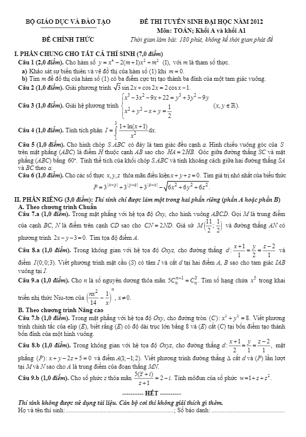 Trong năm 2012, đề thi và đáp án môn Toán khối A đã được công bố. Đây là một tài liệu quan trọng giúp học sinh ôn tập và kiểm tra kiến thức của mình. Đề thi và đáp án cung cấp thông tin chi tiết về nội dung kiểm tra, các dạng bài tập và câu hỏi mẫu giúp học sinh luyện tập hiệu quả.
