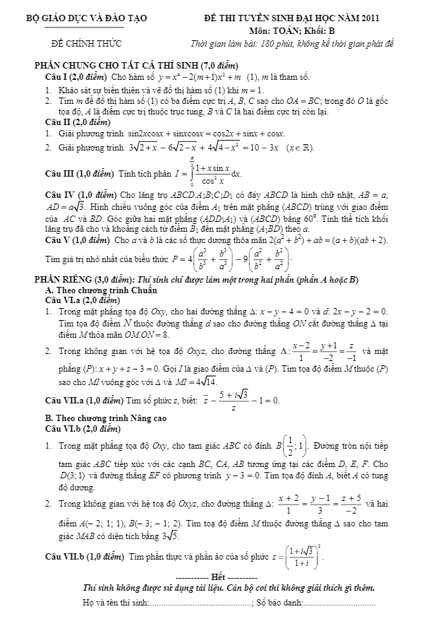 Đề thi và đáp án môn Toán khối B năm 2011 là tài liệu quan trọng để học sinh ôn tập và chuẩn bị cho kỳ thi. Đề thi này cung cấp cho học sinh cơ hội để tự kiểm tra kiến thức và kỹ năng giải các bài toán trong môn Toán.
