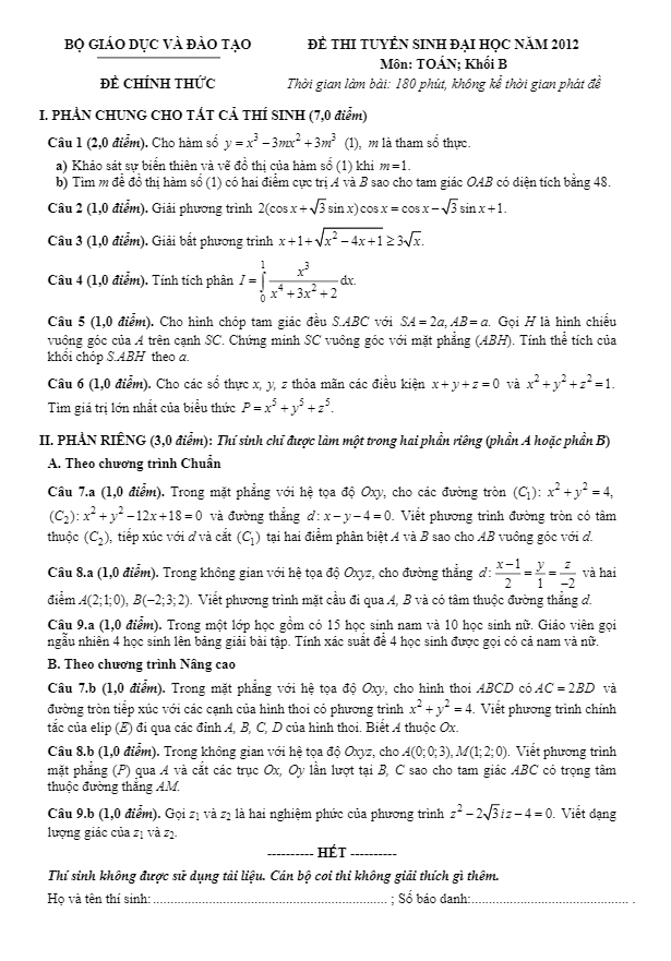 Đề thi và đáp án môn Toán khối B năm 2012 là tài liệu học tập quan trọng cho học sinh cần ôn tập và chuẩn bị cho kỳ thi sắp tới. Bằng cách tham gia làm bài tập và kiểm tra kiến thức thông qua đề thi này, học sinh có thể nắm vững kiến thức, rèn luyện kỹ năng giải bài tập một cách hiệu quả.