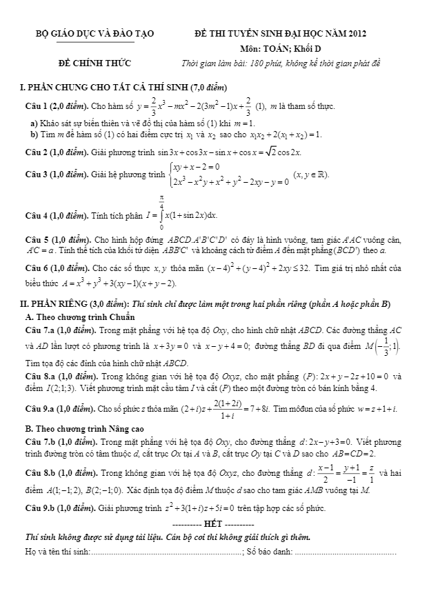 Bài thi môn Toán khối D năm 2012 là một trong những đề thi quan trọng của kỳ thi tốt nghiệp THPT. Đề thi được chia thành nhiều phần với độ khó tăng dần, từ những câu đơn giản đến những bài toán phức tạp. Thí sinh cần phải có kiến thức vững chắc và khả năng giải quyết vấn đề tốt để hoàn thành bài thi một cách xuất sắc.