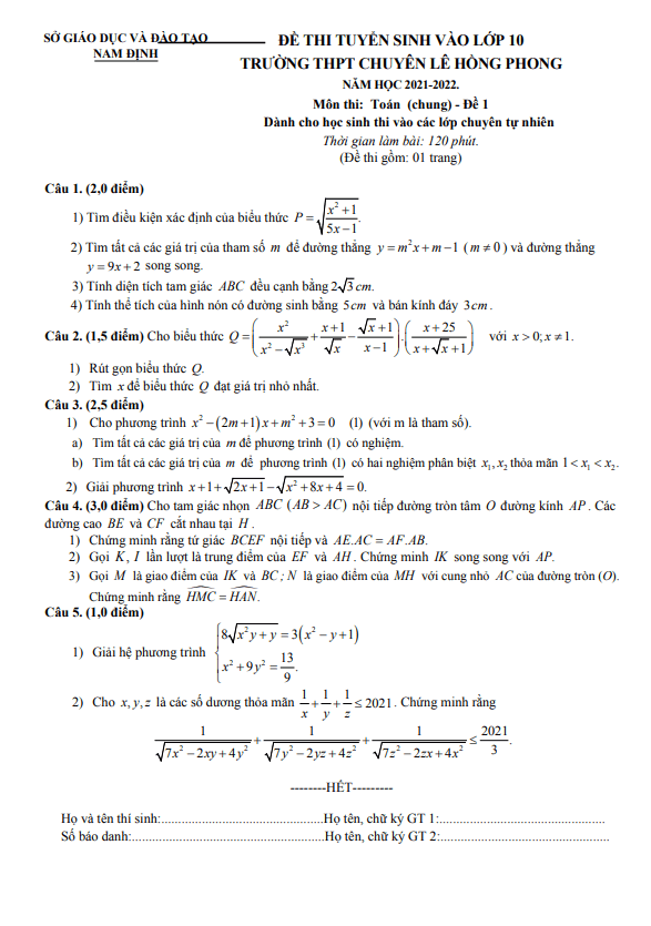 Đề thi vào 10 môn Toán (chung) năm 2021 – 2022 trường chuyên Lê Hồng Phong Nam Định (Đề 1)