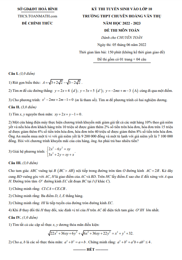 Đề thi vào 10 môn Toán (chuyên) 2022 2023 trường chuyên Hoàng Văn Thụ Hoà Bình