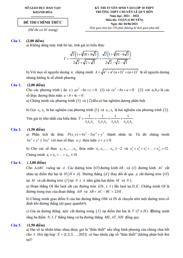Đề thi vào 10 môn Toán (chuyên) năm 2021-2022 của trường chuyên Lê Quý Đôn Khánh Hòa là một bức tranh tuyệt vời về sự sáng tạo và logic. Đề thi không chỉ đòi hỏi kiến thức Toán mà còn cần sự linh hoạt trong tư duy và khả năng suy luận logic.Trên đề thi, có nhiều câu hỏi phức tạp và đòi hỏi sự tinh tế trong cách giải quyết vấn đề. Một trong những câu hỏi đặc biệt là về hình học về hai đường tròn và đường thẳng đi qua chúng, cần chứng minh các định lý và tính chất của các góc, đoạn thẳng trong hình học không gian.Ngoài ra, đề thi còn bao gồm các câu hỏi về tổ hợp và lượng giác, tạo điều kiện cho học sinh thể hiện khả năng suy luận và logic trong việc giải quyết vấn đề. Câu hỏi về việc tìm số thân thiết trong tập hợp số tự nhiên cũng yêu cầu học sinh phải áp dụng kiến thức về chia hết và tổ hợp.Với câu hỏi cuối cùng về kỳ thi chọn đội tuyển năng khiếu của trường T, học sinh sẽ phải vận dụng kiến thức về tổ hợp và logic để tìm ra số môn thi cần tổ chức để đảm bảo điều kiện cho toàn bộ thí sinh tham gia.Tóm lại, đề thi vào 10 môn Toán (chuyên) năm 2021-2022 của trường chuyên Lê Quý Đôn Khánh Hòa không chỉ là bài kiểm tra kiến thức mà còn là cơ hội để học sinh phát huy khả năng suy luận, logic và tư duy sáng tạo. Đây là bài thi đầy thách thức nhưng cũng đầy bổ ích để giúp học sinh phát triển và thể hiện tài năng của mình.