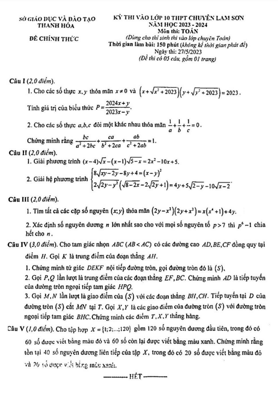 Sytu xin gửi đến quý thầy cô và các bạn học sinh đề thi chính thức kỳ thi tuyển sinh vào lớp 10 môn Toán (dành cho thí sinh thi vào lớp chuyên Toán) của trường THPT chuyên Lam Sơn, tỉnh Thanh Hóa, diễn ra vào ngày 27 tháng 05 năm 2023.