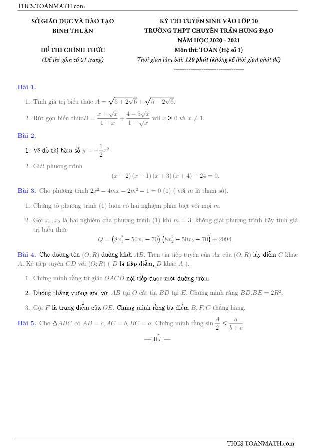Đề thi vào 10 môn Toán (hệ số 1) năm 2020 2021 trường chuyên Trần Hưng Đạo Bình Thuận