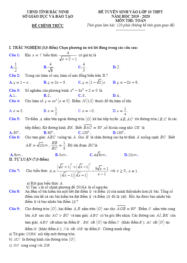 Đề Toán tuyển sinh năm 2019-2020 sở GD ĐT Bắc Ninh