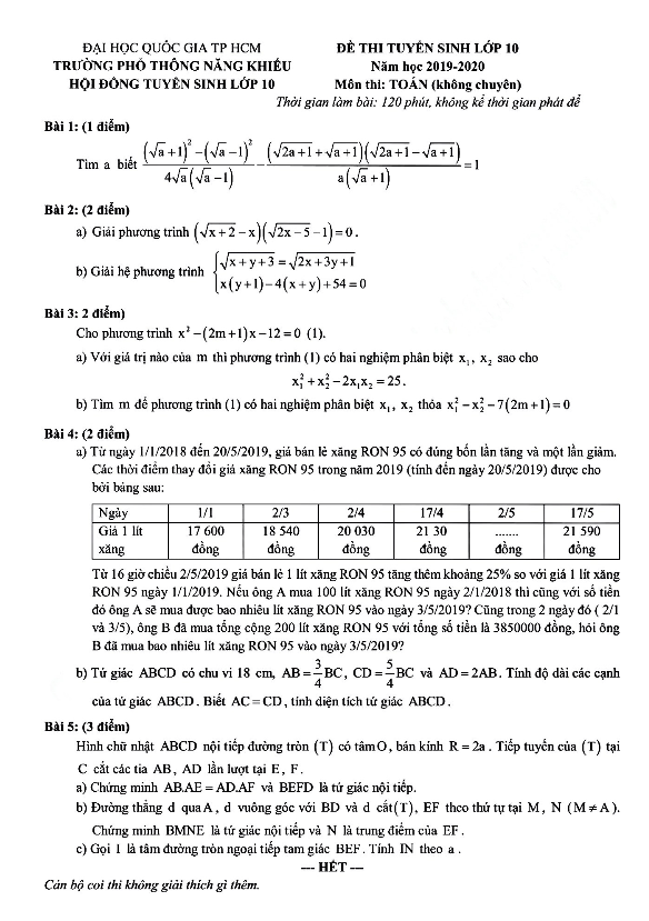 Trong kỳ thi tuyển sinh vào lớp 10 trường Phổ thông Năng khiếu, Đại học Quốc gia TP HCM diễn ra vào sáng thứ Bảy, ngày 25 tháng 05 năm 2019, học sinh khối không chuyên được yêu cầu làm bài toán Toán. Đề Toán bao gồm 5 bài toán dạng tự luận, học sinh được 120 phút để làm bài.