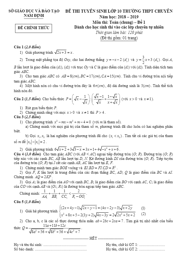 Đề Toán tuyển sinh lớp 10 THPT chuyên 2018 – 2019 sở GD và ĐT Nam Định (đề chung dành cho tất cả các thí sinh) là bài thi được thiết kế theo hình thức tự luận, bao gồm 5 bài toán. Thời gian làm bài là 120 phút, nhằm tiêu chí tuyển chọn học sinh lớp 9 có năng khiếu môn Toán để học tại các trường THPT chuyên tại tỉnh Nam Định. Đề thi đi kèm lời giải chi tiết, giúp học sinh có cái nhìn rõ ràng và chi tiết về cách giải các bài toán.