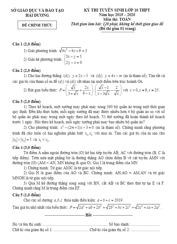Đề Toán tuyển sinh THPT năm 2019 – 2020 sở GD ĐT Hải Dương