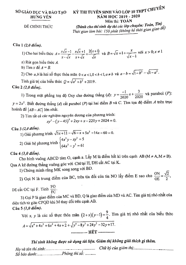 Đề Toán tuyển sinh vào 10 chuyên năm 2019 2020 sở GD ĐT Hưng Yên
