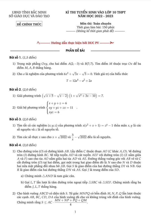 Sytu xin gửi đến quý thầy cô và các em học sinh lớp 9 đề thi chính thức kỳ thi tuyển sinh vào lớp 10 THPT chuyên môn Toán (chuyên) năm học 2022 – 2023 sở GD&ĐT Bắc Ninh. Đề thi này dành cho thí sinh muốn thi vào các lớp 10 chuyên Toán và chuyên Tin học. Đề thi bao gồm đáp án và lời giải chi tiết.