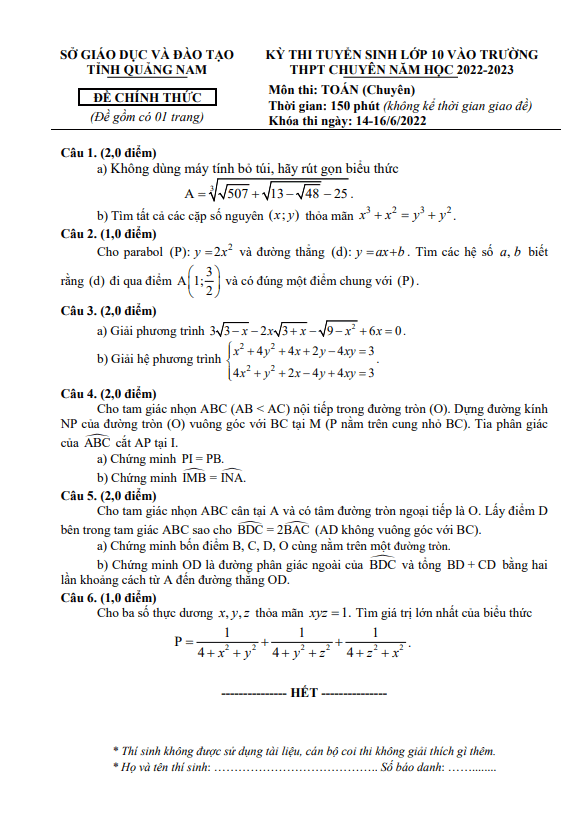 Đề thi tuyển sinh lớp 10 chuyên môn Toán (chuyên) 2022-2023 sở GD&ĐT Quảng Nam
