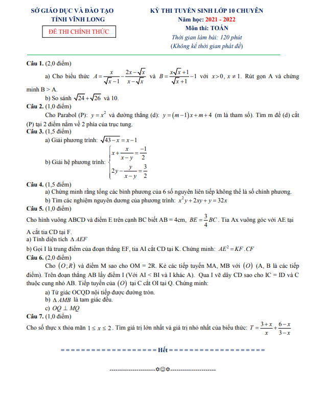 Đề tuyển sinh lớp 10 chuyên môn Toán (chuyên) năm 2021 – 2022 sở GDĐT Vĩnh Long có những câu hỏi thú vị như: