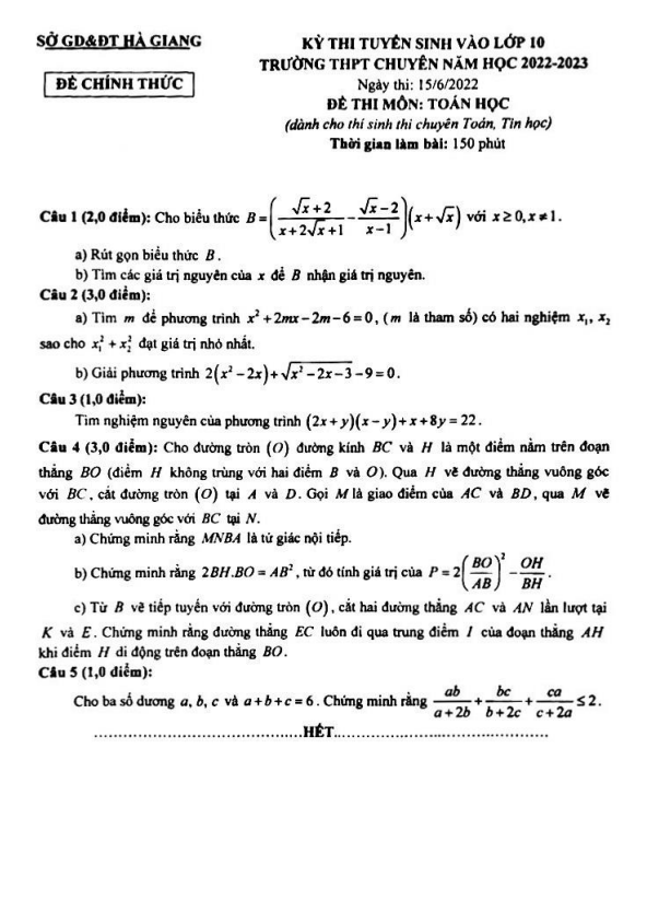 Dưới đây là một số câu hỏi trích dẫn từ đề tuyển sinh lớp 10 chuyên môn Toán (chuyên) năm 2022-2023 của sở GDĐT Hà Giang: