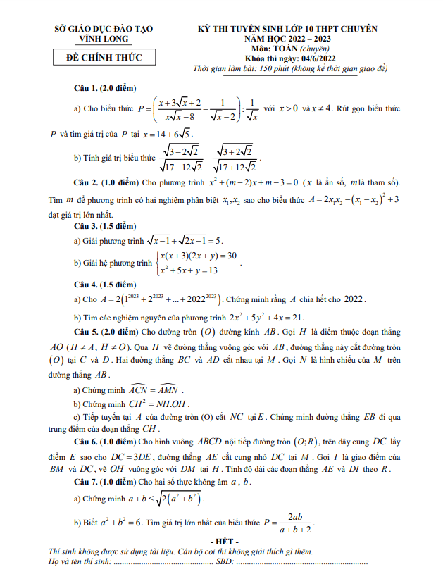 Đề thi tuyển sinh chuyên môn Toán (chuyên) năm 2022-2023 sở GDĐT Vĩnh Long