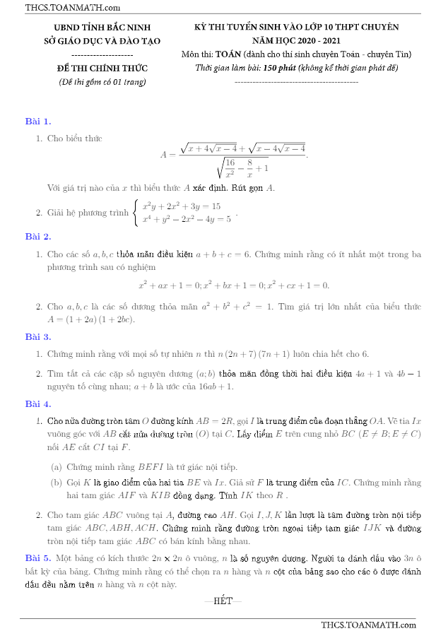 Đề tuyển sinh chuyên môn Toán năm 2020 2021 sở GD ĐT Bắc Ninh