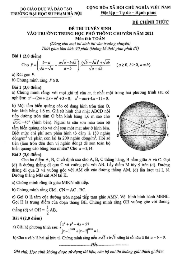 Trích đoạn đề tuyển sinh lớp 10 chuyên môn Toán năm 2021 trường ĐHSP Hà Nội:
