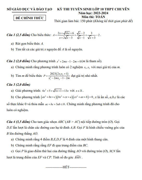 Đề thi tuyển sinh chuyên môn Toán năm 2023-2024 sở GDĐT Bình Dương