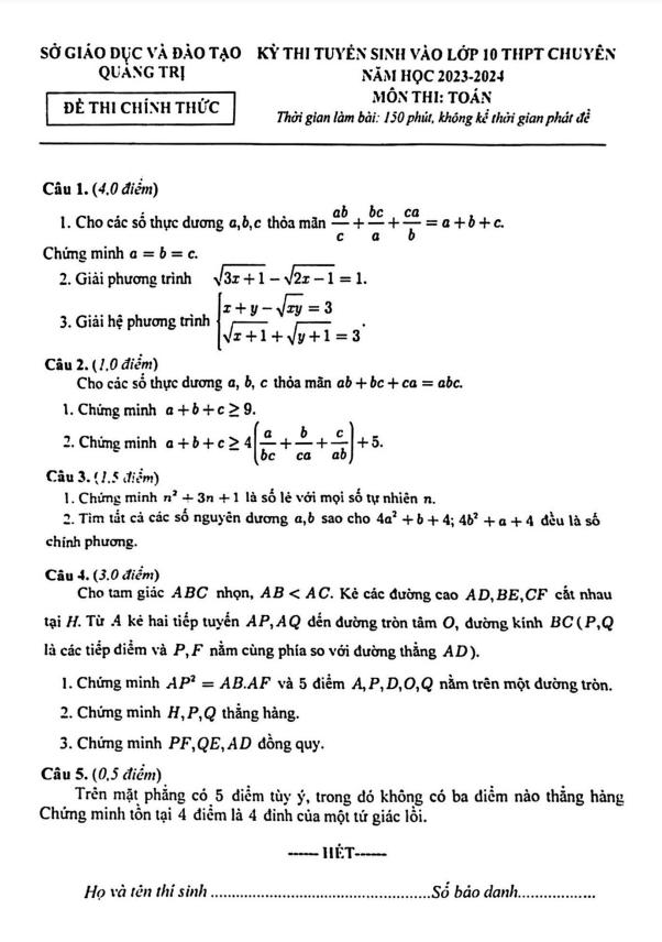 Chúng tôi xin gửi đến quý thầy cô và các em học sinh đề thi chính thức cho kỳ thi tuyển sinh vào lớp 10 THPT chuyên môn Toán năm học 2023-2024 của Sở Giáo dục và Đào tạo tỉnh Quảng Trị. Kỳ thi sẽ diễn ra vào ngày 03 tháng 06 năm 2023.