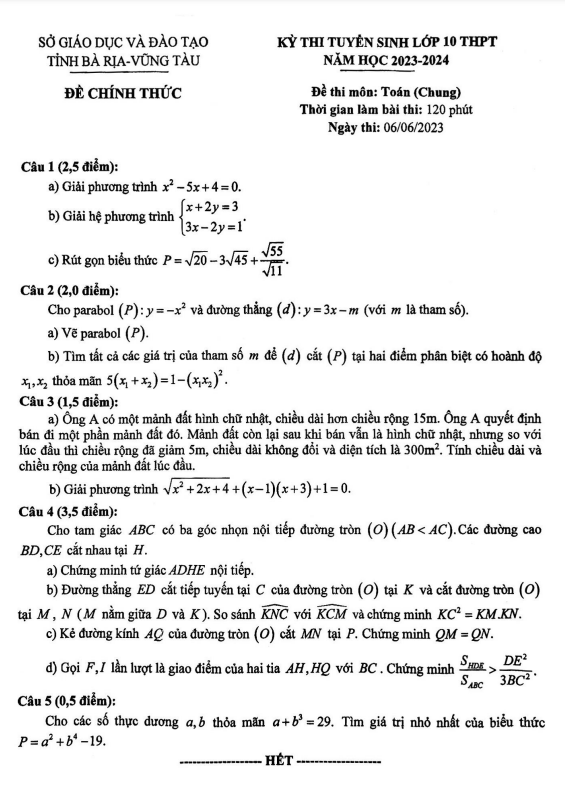 Đề tuyển sinh môn Toán (chung) năm 2023 2024 sở GD ĐT Bà Rịa Vũng Tàu