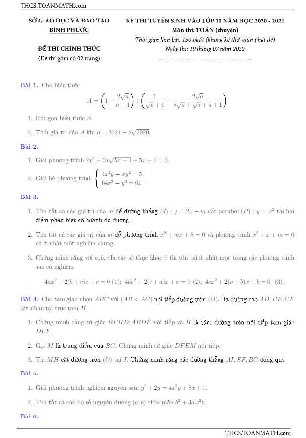 Đề tuyển sinh môn Toán (chuyên) năm 2020 – 2021 sở GD&ĐT Bình Phước