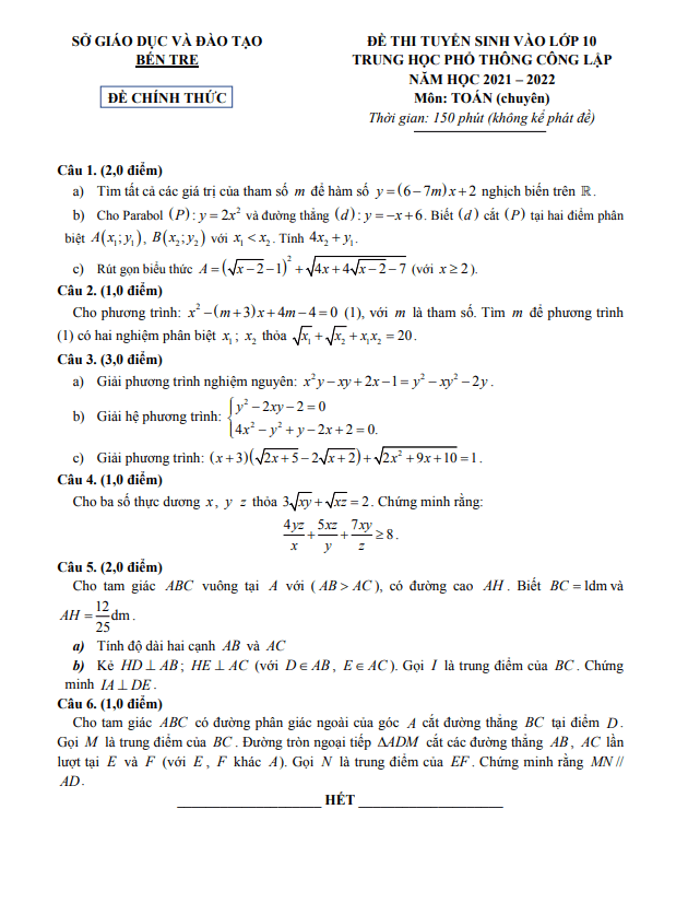 Đề tuyển sinh môn Toán (chuyên) năm 2021 – 2022 sở GD&ĐT Bến Tre