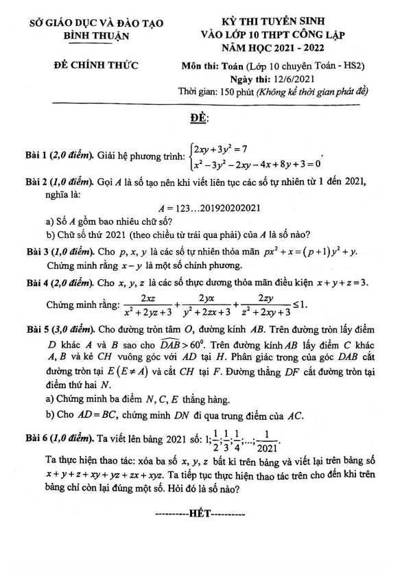 Đề tuyển sinh môn Toán (chuyên) năm 2021 – 2022 sở GD&ĐT Bình Thuận