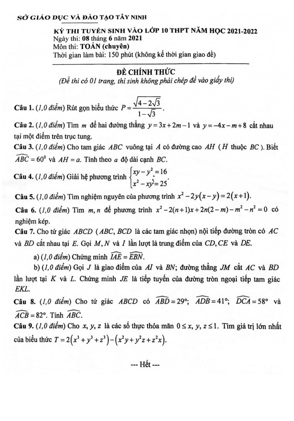 Đề tuyển sinh môn Toán (chuyên) năm 2021-2022 sở GD&ĐT Tây Ninh