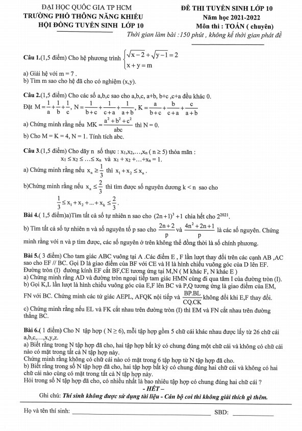 Đề tuyển sinh môn Toán (chuyên) năm 2021 – 2022 trường PTNK TP HCM