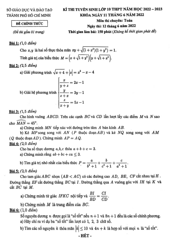 Chúng tôi xin giới thiệu đến quý thầy, cô giáo và các em học sinh lớp 9 đề thi chính thức kỳ thi tuyển sinh vào lớp 10 THPT môn Toán (chuyên) năm học 2022-2023 của sở Giáo dục và Đào tạo thành phố Hồ Chí Minh. Kỳ thi sẽ diễn ra vào chiều Chủ Nhật ngày 12 tháng 06 năm 2022. Đề thi bao gồm đáp án và lời giải chi tiết.
