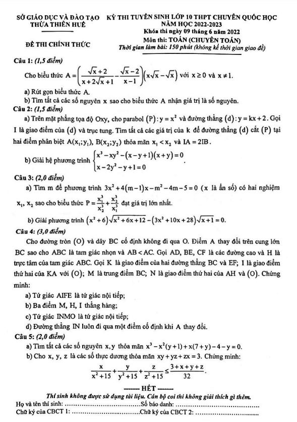Đề thi tuyển sinh môn Toán (chuyên) năm 2022 2023 trường chuyên Quốc học Huế