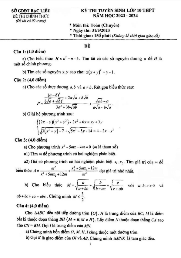 Đề thi tuyển sinh môn Toán (chuyên) năm 2023 – 2024 sở GD&ĐT Bạc Liêu