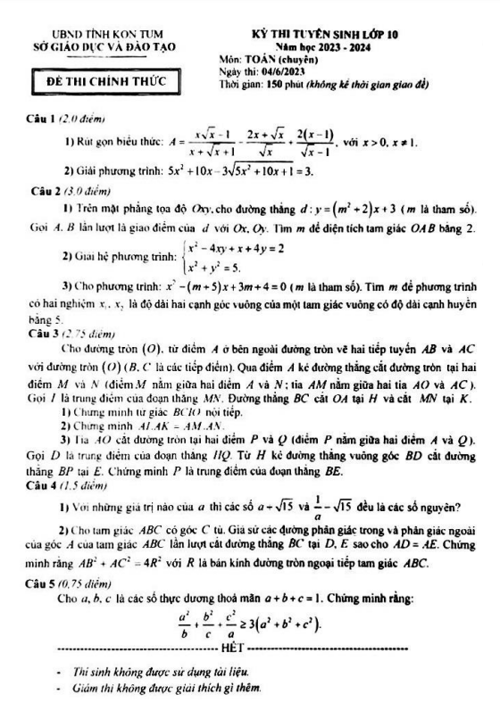 Đề thi tuyển sinh môn Toán (chuyên) năm 2023-2024 sở GD ĐT Kon Tum