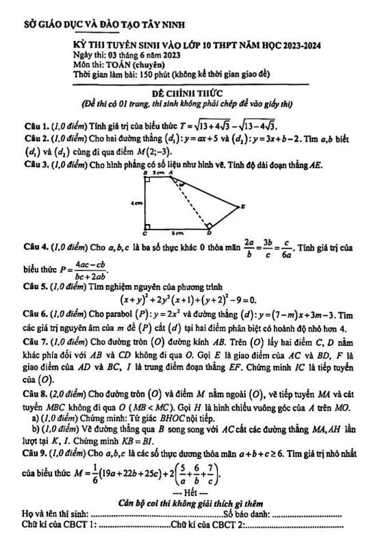 Đề thi tuyển sinh môn Toán (chuyên) năm 2023 – 2024 sở GD&ĐT Tây Ninh