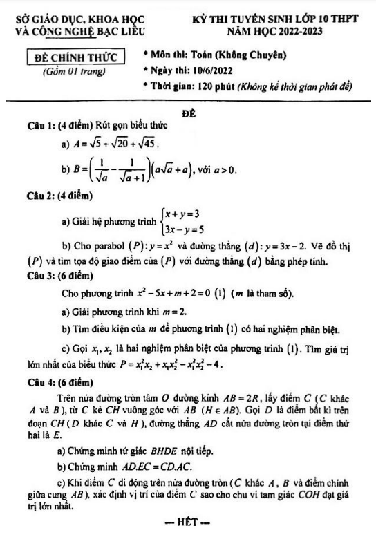 Đề tuyển sinh môn Toán (không chuyên) năm 2022 – 2023 sở GDKHCN Bạc Liêu