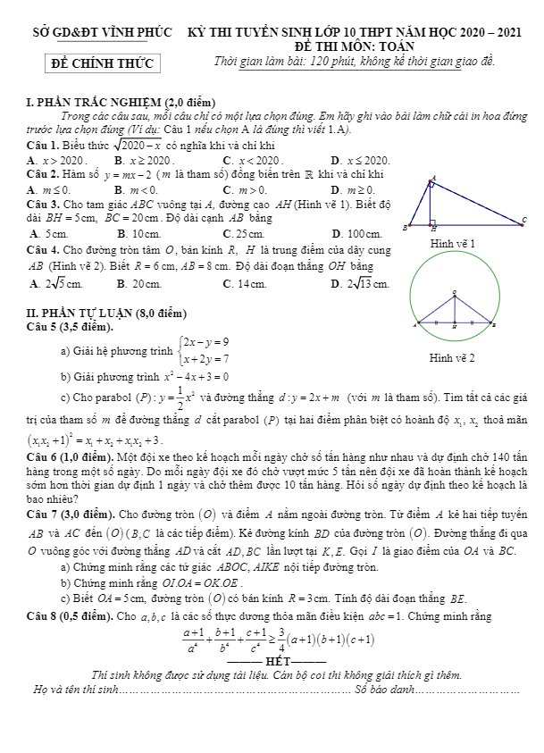 Đề tuyển sinh môn Toán năm 2020 – 2021 sở GD&ĐT Vĩnh Phúc