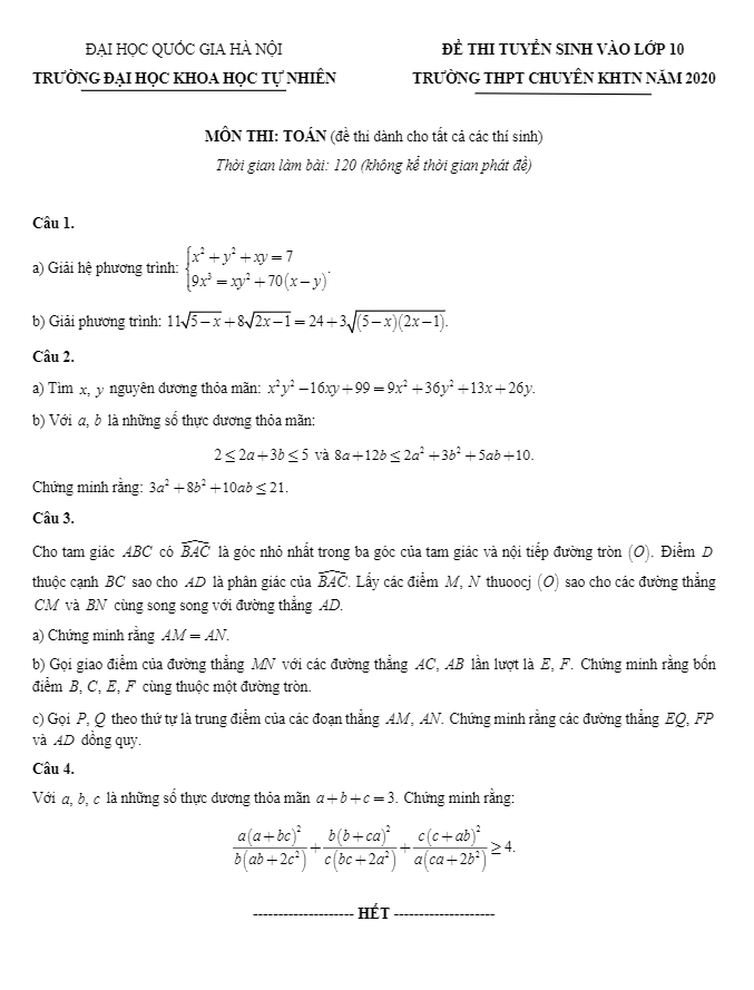 Vào chiều Chủ Nhật ngày 12 tháng 07 năm 2020, trường THPT chuyên Khoa học Tự nhiên, Đại học Khoa học Tự nhiên, Đại học Quốc gia Hà Nội đã tổ chức kỳ thi tuyển sinh vào lớp 10 môn Toán cho năm học 2020 – 2021. Đề tuyển sinh lớp 10 môn Toán năm 2020 trường THPT chuyên KHTN Hà Nội (Đề chung) là đề thi vòng 1, được dành cho tất cả các thí sinh tham dự kỳ thi. Đề thi bao gồm 01 trang với 04 bài toán tự luận, thời gian làm bài 120 phút. Đề thi được đánh giá là khó.