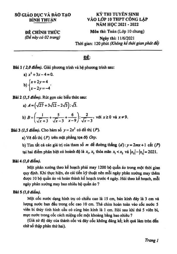 Đề tuyển sinh môn Toán năm 2021 – 2022 sở GD&ĐT Bình Thuận