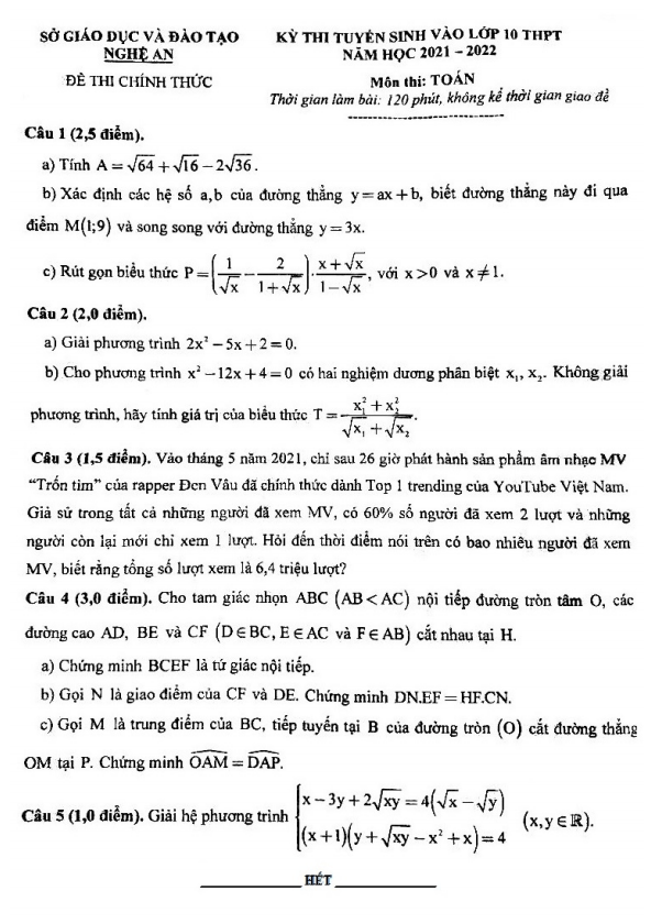 Đề Thi Tuyển Sinh Môn Toán Năm 2021-2022 Sở GD&ĐT Nghệ An