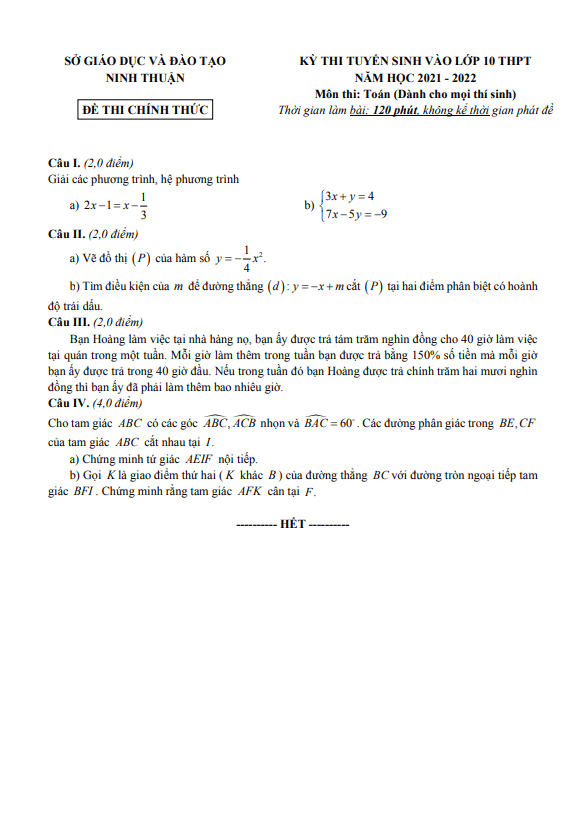 Đề tuyển sinh môn Toán năm 2021-2022 sở GD ĐT Ninh Thuận