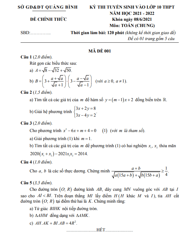Đề tuyển sinh môn Toán năm 2021 – 2022 sở GD&ĐT Quảng Bình