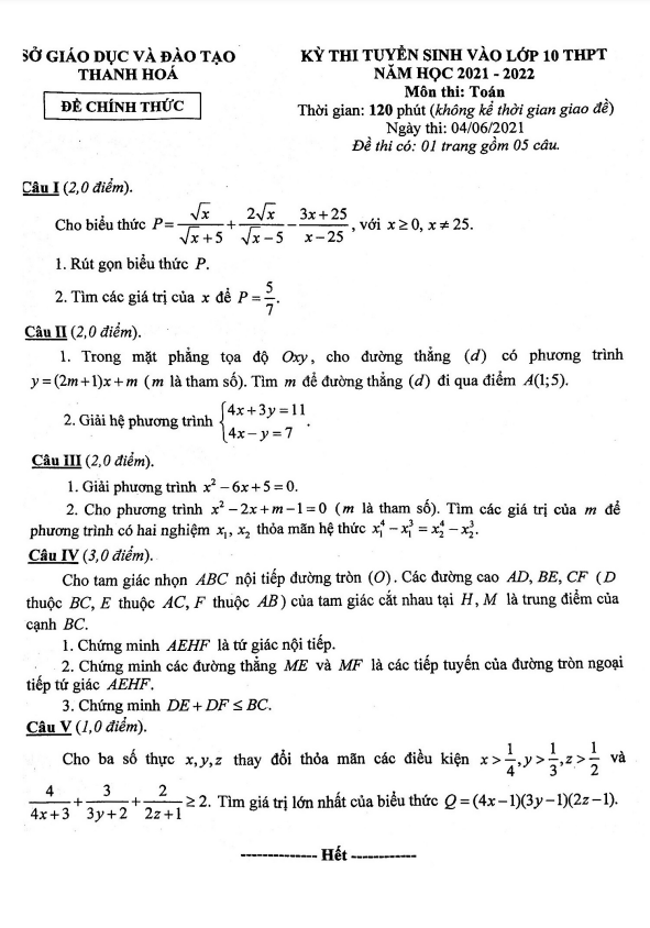 Đề tuyển sinh môn Toán năm 2021 – 2022 sở GD&ĐT Thanh Hóa