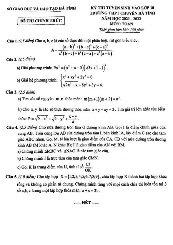 Đề tuyển sinh môn Toán năm 2021-2022 trường THPT chuyên Hà Tĩnh
