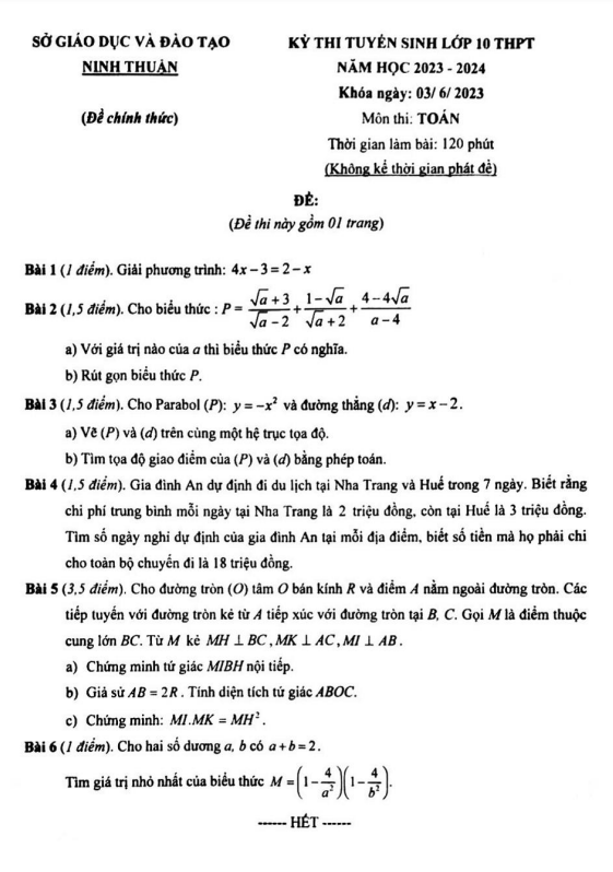 Đề tuyển sinh môn Toán 2023-2024 sở GD&ĐT Ninh Thuận