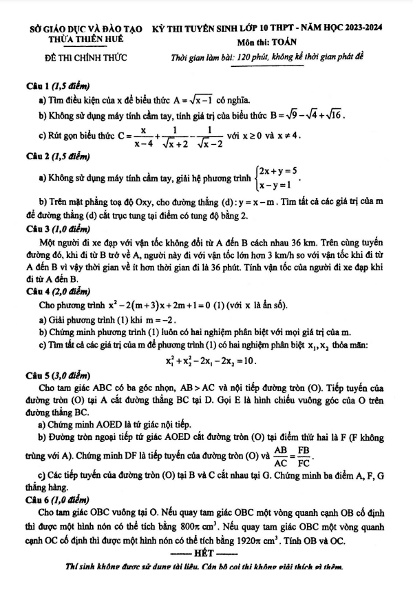 Đề tuyển sinh môn Toán năm 2023 – 2024 sở GD ĐT Thừa Thiên Huế