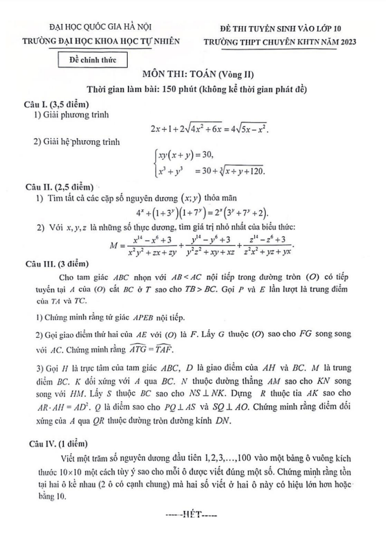 Một số câu hỏi đáng chú ý trong đề tuyển sinh lớp 10 môn Toán vòng 2 năm 2023 trường THPT chuyên KHTN Hà Nội bao gồm: