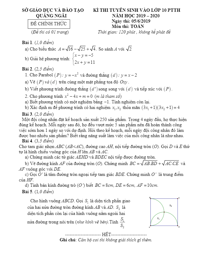 Đề tuyển sinh năm 2019-2020 môn Toán sở GD&ĐT Quảng Ngãi