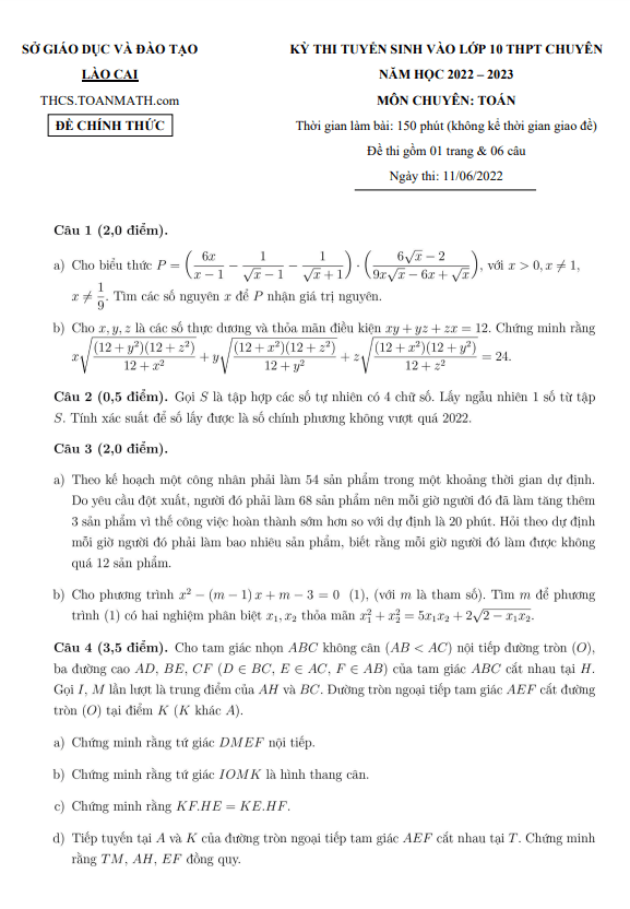 Đề tuyển sinh THPT chuyên môn Toán năm 2022 2023 sở GD ĐT Lào Cai