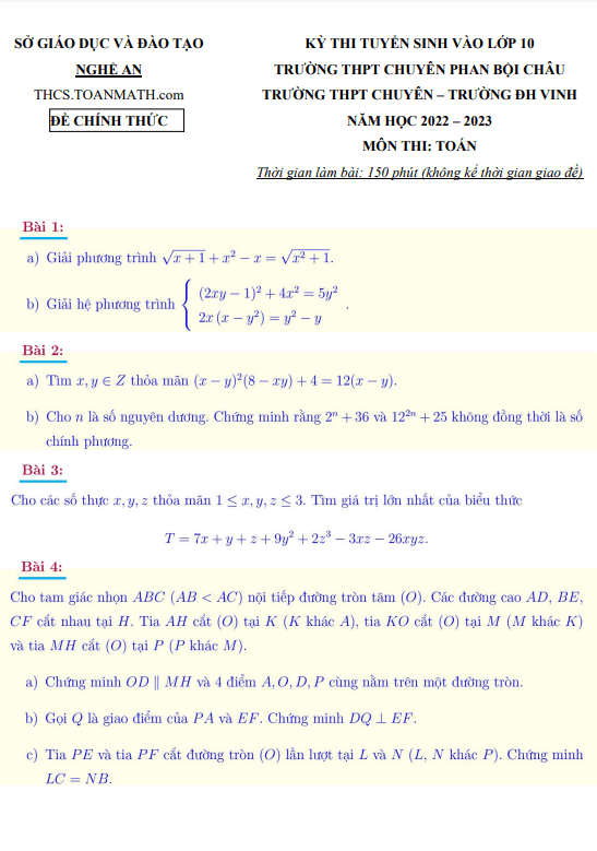 Xin chào quý thầy, cô và các em học sinh lớp 9! Sytu hân hạnh giới thiệu đến quý vị đề thi chính thức của kỳ thi tuyển sinh vào lớp 10 THPT chuyên môn Toán năm học 2022 – 2023 tại sở Giáo dục và Đào tạo tỉnh Nghệ An. Đây là đề thi dành cho các thí sinh đăng ký thi vào trường THPT chuyên Phan Bội Châu và trường THPT chuyên ĐH Vinh, tỉnh Nghệ An. Đề thi bao gồm đáp án và lời giải chi tiết, do Nguyễn Nhất Huy và thầy Trịnh Văn Luân thực hiện.